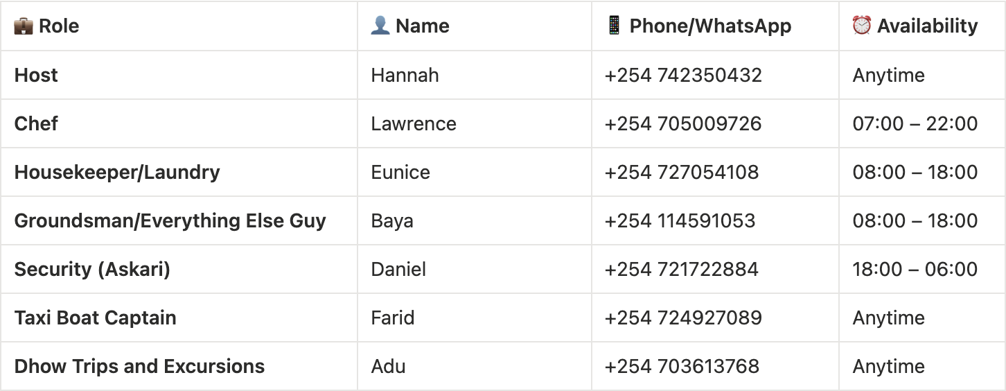 💸 Tips: Our team take great pride in looking after Mbibo House and our guests. In Kenya it’s customary to show appreciation with a cash tip if you’ve enjoyed the service. You’re very welcome to give this directly to each team member, or leave it with Hannah and it will be shared with the team.